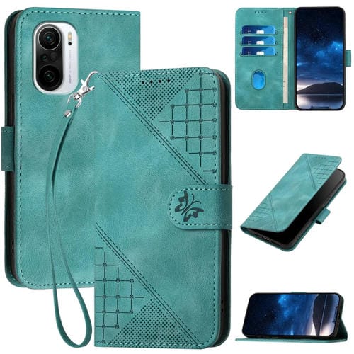 Funda de Cuero con Tapa y Cordón para Xiaomi Poco F3 Yx0080 con Diseño de Mariposa En Relieve y Cuadrícula (Azul Claro)