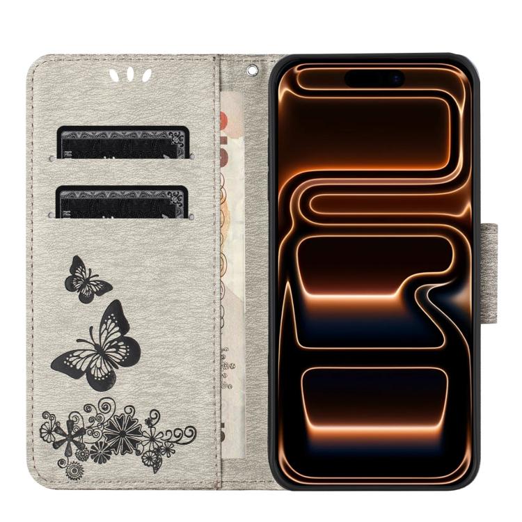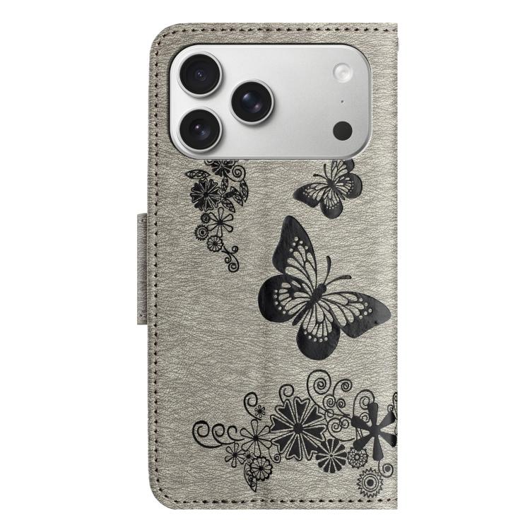 Funda de cuero con tapa y diseño de mariposas en relieve para iPhone 17 Pro Max (gris)