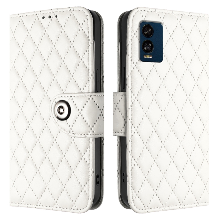 Funda de Cuero con Tapa y Textura Rombal para Blu View Speed 5G con Cordón (Blanco)