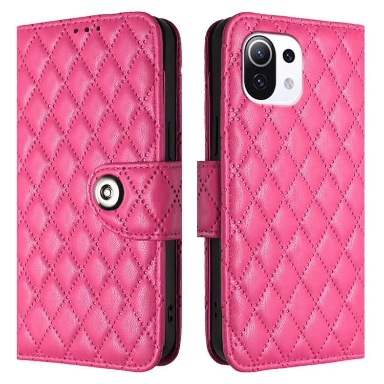 Funda de Cuero con Tapa y Textura Rómbica para Xiaomi 11 Lite 5G Ne con Cordón (Rosa Rojo)