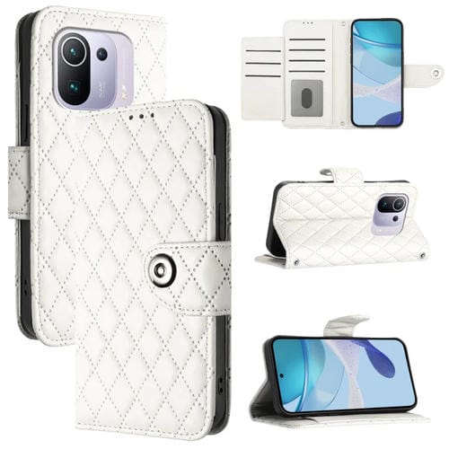Funda de Cuero con Tapa y Textura Rómbica para Xiaomi Mi 11 Pro con Cordón (Blanco)