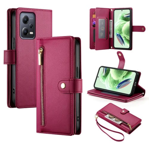 Funda de Cuero para Teléfono con Nueve Ranuras para Tarjetas y Cremallera para Redmi Note 12 5G/Xiaomi Poco X5 (Rojo)