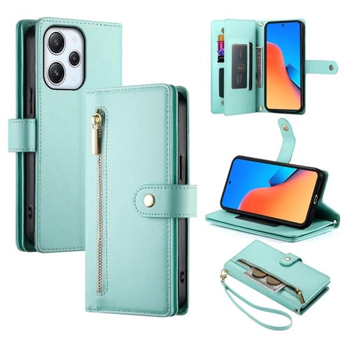 Funda de Cuero para Teléfono Redmi 12 5G/4G/Note 12R con Nueve Ranuras para Tarjetas y Cremallera (Verde Menta)