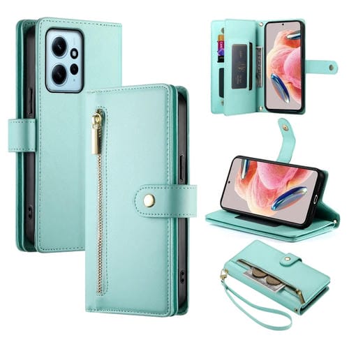 Funda de Cuero para Teléfono Redmi Note 12 4G/Note 12R Pro con Nueve Ranuras para Tarjetas y Cremallera (Verde Menta)
