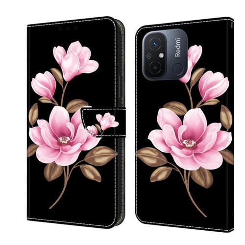Funda de Cuero Pintada a Mano para Redmi 12C/11A (Flores Negras)