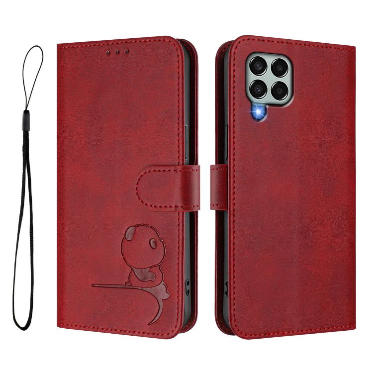 Funda de cuero RFID con estampado de panda y cordón para Samsung Galaxy M33 5G (rojo vino)