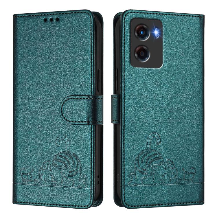 Funda de Cuero Rfid Motorola Moto G05 con Estampado de Rata y Gato en Relieve y Cordón (Verde Pavo Real)