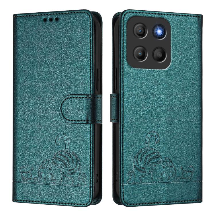 Funda de Cuero Rfid Motorola Moto G15 con Estampado de Rata y Gato en Relieve y Cordón (Verde Pavo Real)