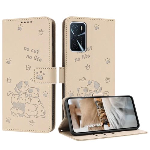 Funda de Piel con Diseño de Gatito En Relieve y Cordón para Oppo A16/A16S/A54S (Beige)