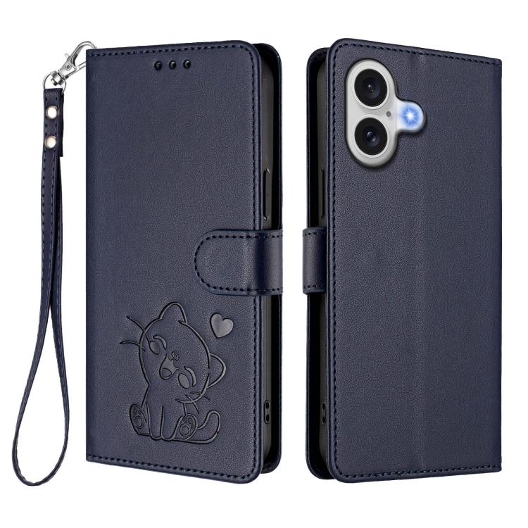 Funda de piel con diseño de gato y corazón en relieve para iPhone 17 con correa de mano (azul)