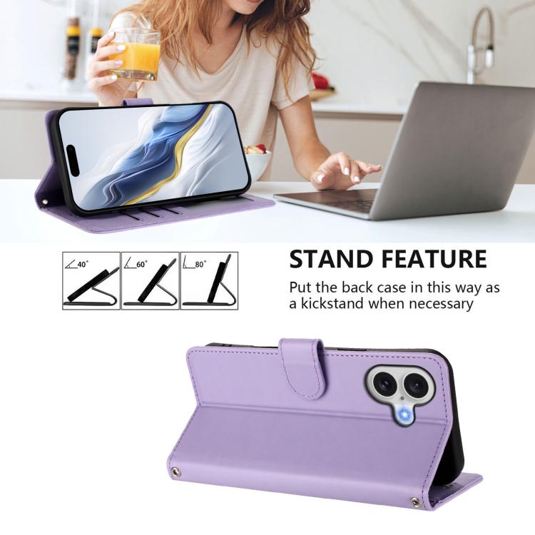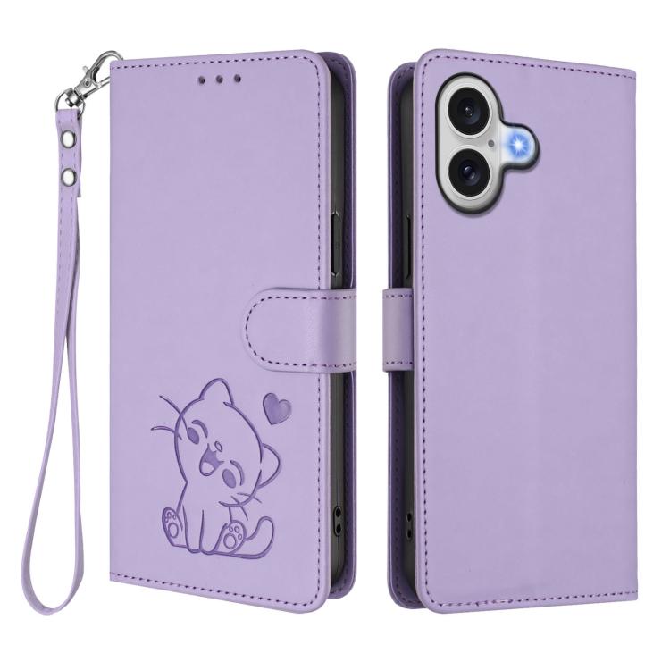 Funda de piel con diseño de gato y corazón en relieve para iPhone 17 con correa de mano (morado claro)