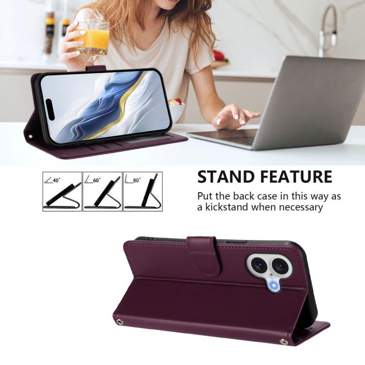 Funda de piel con diseño de gato y corazón en relieve para iPhone 17 con correa de mano (morado oscuro)