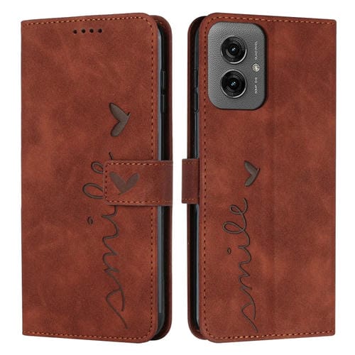Funda de Piel con Relieve de Corazón y Cordón Largo para Motorola Moto G55 (Marrón)