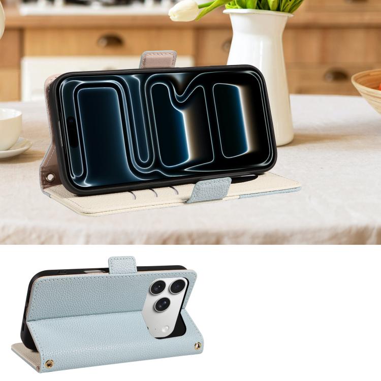 Funda de piel con textura de lichi y espejo para iPhone 17 Pro (Azul)