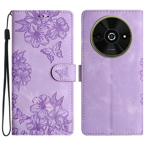Funda de Teléfono de Pu con Relieve de Piel de Mariposa y Diseño de Flor de Cerezo para Xiaomi Poco C61 (Morado)