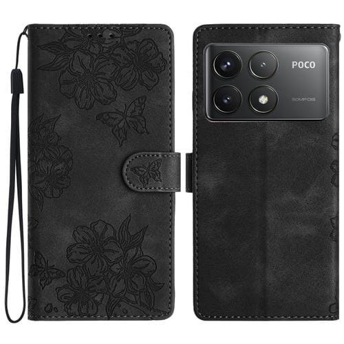 Funda de Teléfono de Pu con Relieve de Piel de Mariposa y Flor de Cerezo para Xiaomi Poco F6 Pro (Negra)