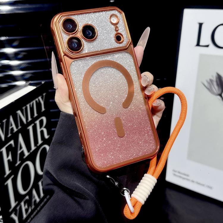 Funda de TPU MagSafe con ventana grande, brillo degradado, mate, galvanizada, con correa de mano para iPhone 17 Pro Max (naranja)