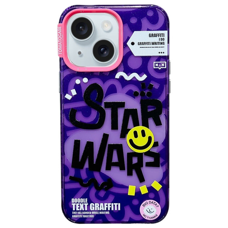 Funda híbrida TPU y PC con texto en grafiti y tomate para iPhone 14 (Morado)