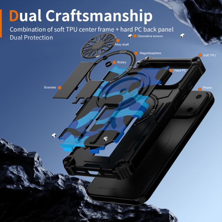 Funda MagSafe con soporte giratorio y camuflaje para iPhone 17 (fibra de carbono azul cielo)