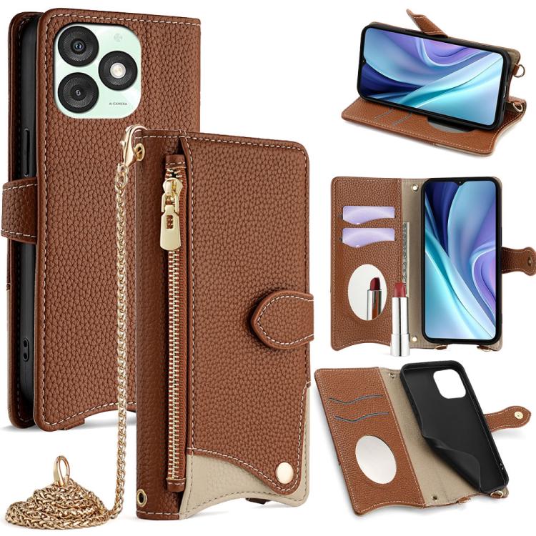 Funda para Teléfono Itel A50 con Cadena Cruzada y Cola de Pez de Cuero de Lichi (Marrón)