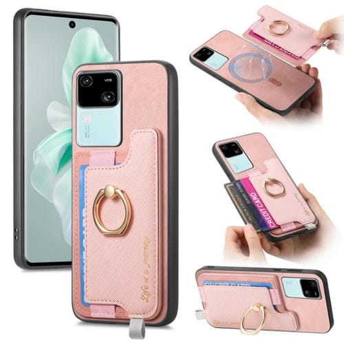 Funda para Teléfono con TaRJetero y Anillo de Cuero con Diseño Retro Magsafe para Vivo S18/S18 Pro 5G (Rosa)