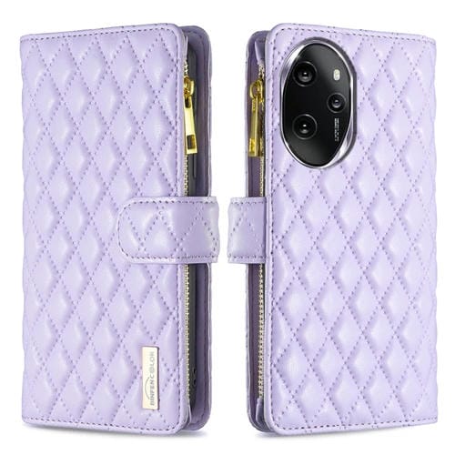 Funda de Cuero con Tapa para Honor 100 Pro Diamond Lattice Zipper Wallet (Púrpura)