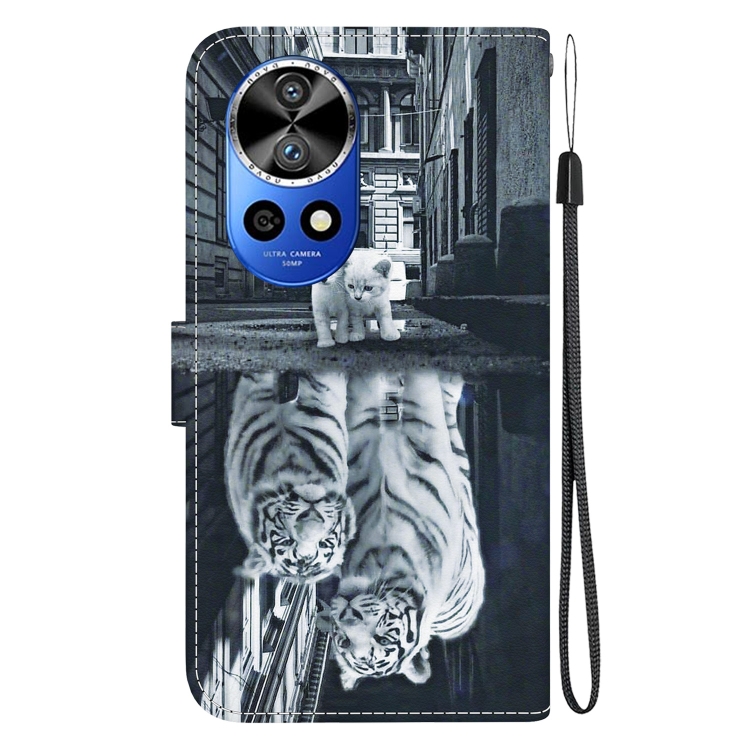 Funda de Cuero para Huawei Nova 12 Pro con Dibujo Coloreado y Textura de Cristal (Reflejo de Tigre Gato)