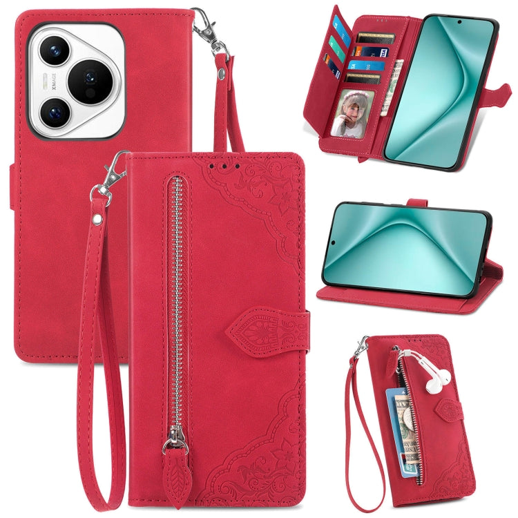 Funda de Cuero para Huawei Pura 70 Pro+ con Cremallera y Flores en Relieve (Rojo)