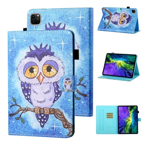 Funda de Cuero Inteligente para iPad Pro 11 (2024) con Costuras y Dibujos a Color (Búho Azul)