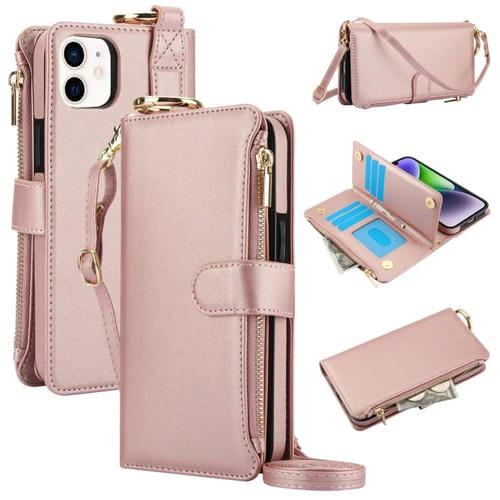 Funda para Teléfono iPhone 11 Cuero con Billetera Multifuncional y Anillo Cruzado (Oro Rosa)