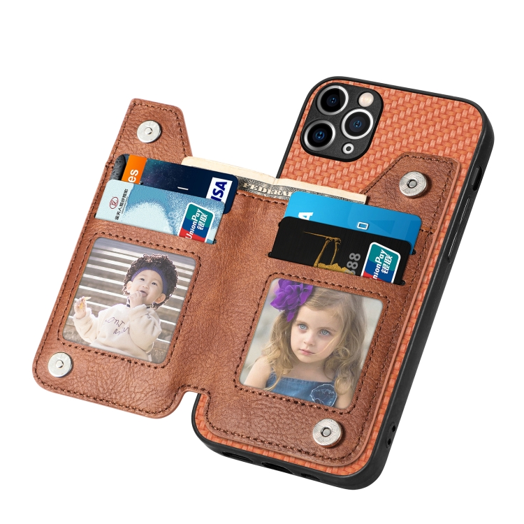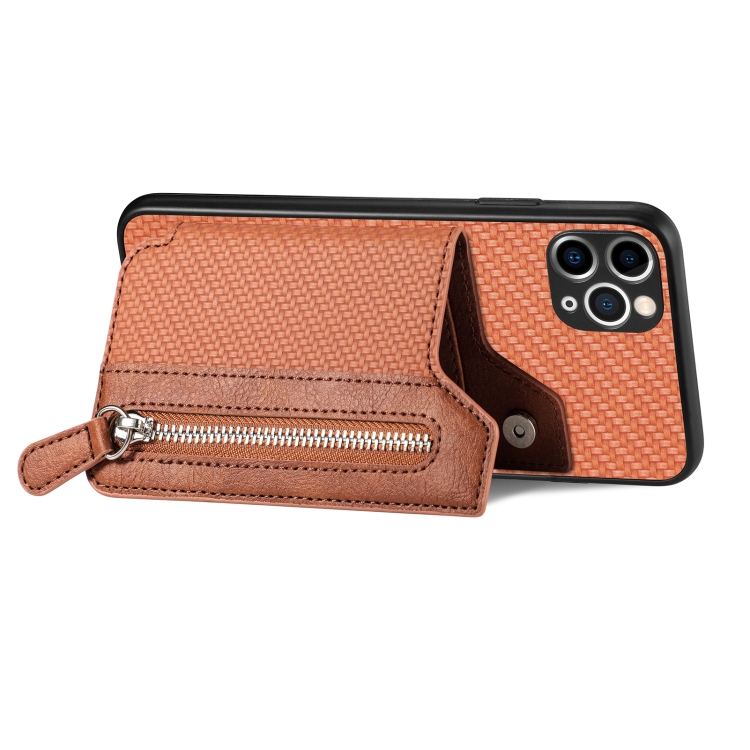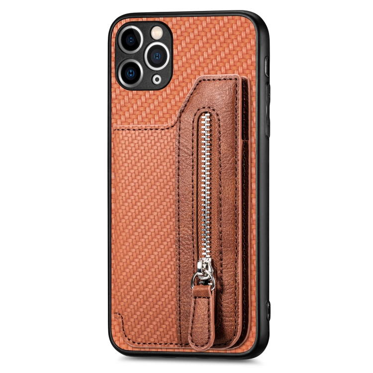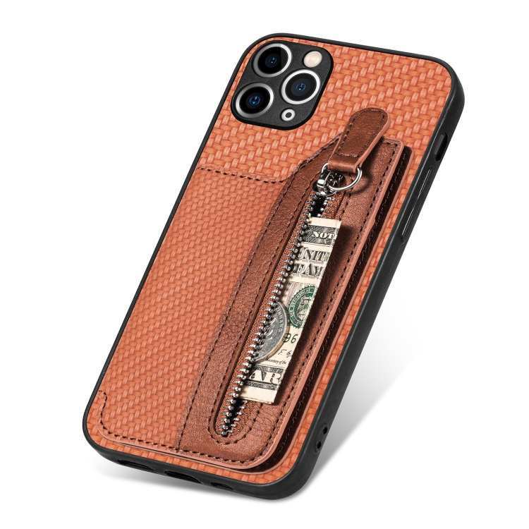 Funda para iPhone 11 Pro Carbon Fiber Horizontal Flip Zipper Wallet Phone Case (Marrón)