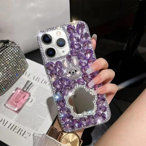 Funda para Teléfono iPhone 11 Pro Diamond Mirror Bunny Hecha a Mano para PC (Espejo de Flor Púrpura)