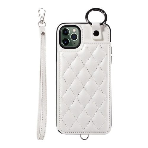 Estuche para Teléfono iPhone 11 Pro Max Bolsa para Tarjetas Textura Rómbica Cordón Corto (Blanco)