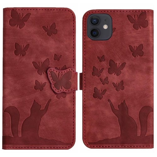 Funda de Cuero para iPhone 12 Mini con Tapa y Estampado de Gato Mariposa (Rojo)