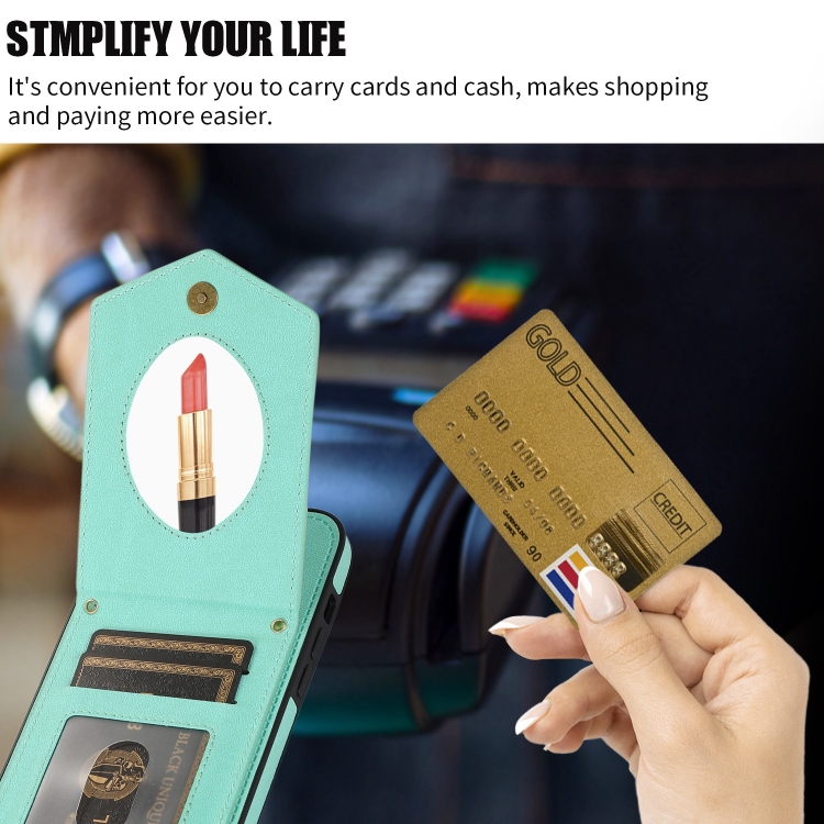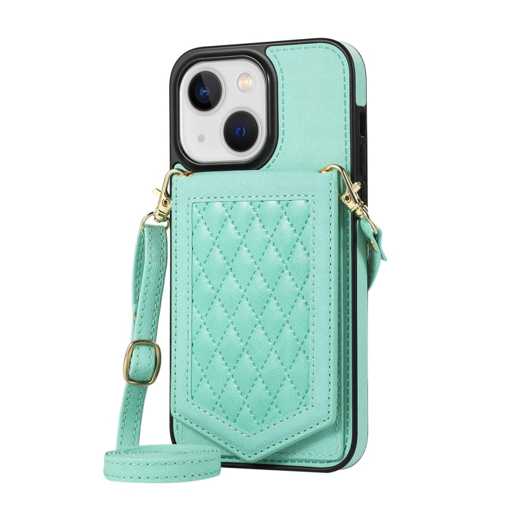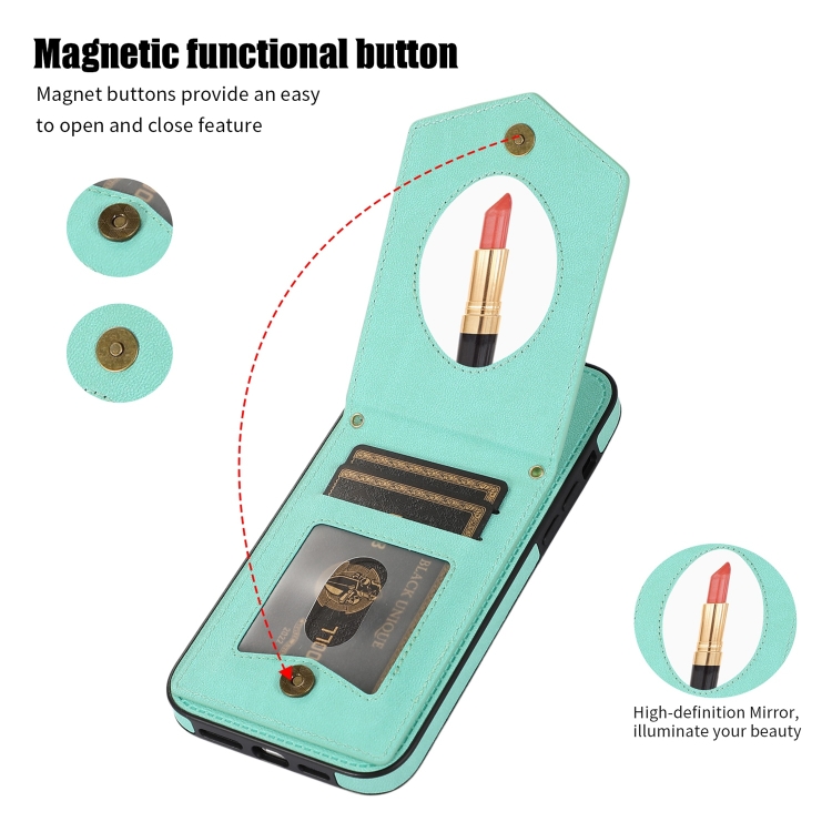 Funda para iPhone 13 Mini Rhombic Texture Rfid con Cordón y Espejo (Verde Menta)