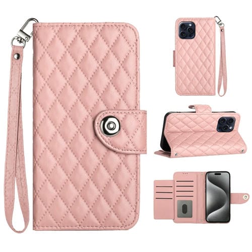 Funda para Teléfono iPhone 13 Pro Max con Tapa de Cuero Textura Rómbica y Cordón (Rosa Coral)