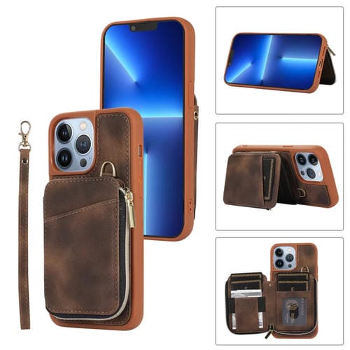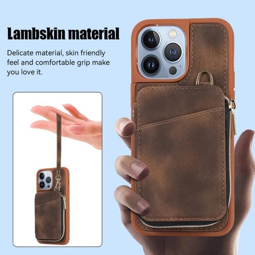 Funda para Teléfono iPhone 13 Pro Max Zipper Card Bag Contraportada (Marrón)