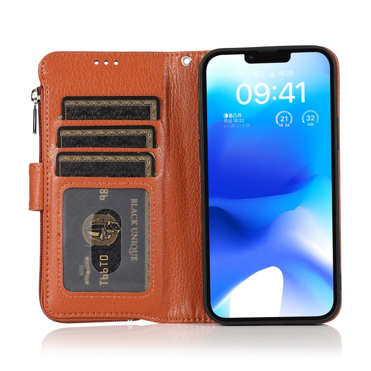Funda para iPhone 14 de Cuero con Cremallera y Microfibra para Teléfono (Marrón)