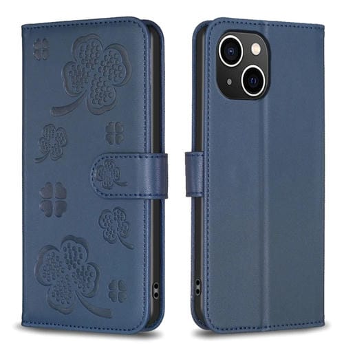 Funda para Teléfono iPhone 14 Cuero En Relieve de Cuatro Hojas (Azul)