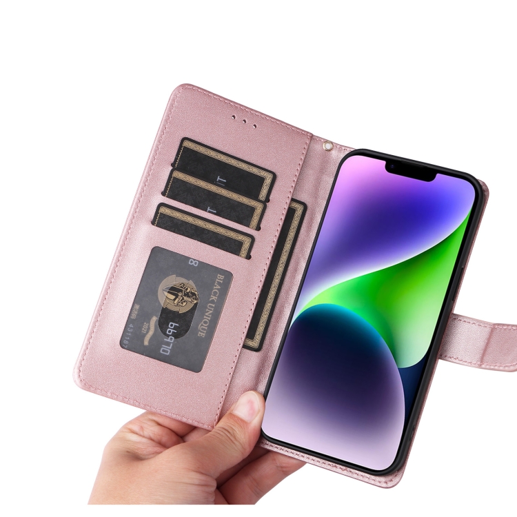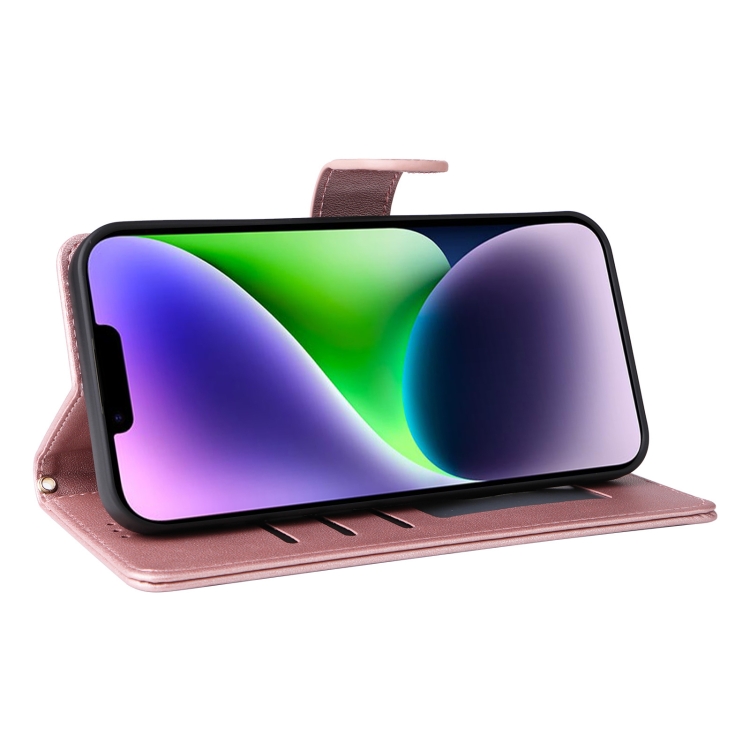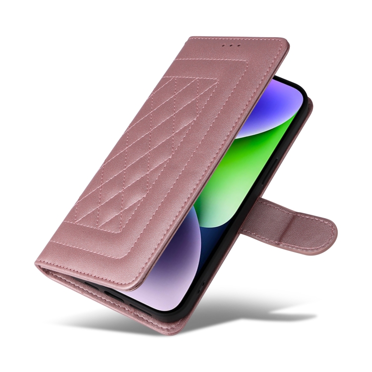 Funda para Teléfono iPhone 14 Plus con Tapa de Cuero Entramado de Diamantes (Oro Rosa)