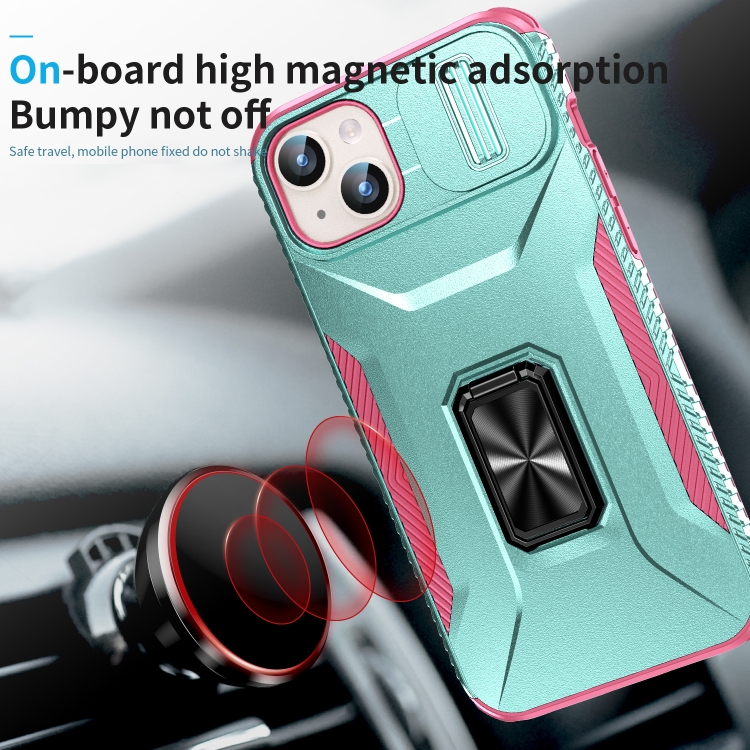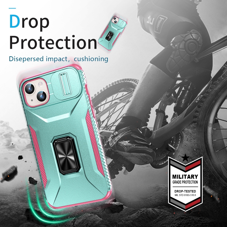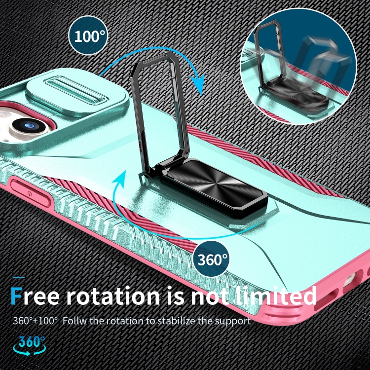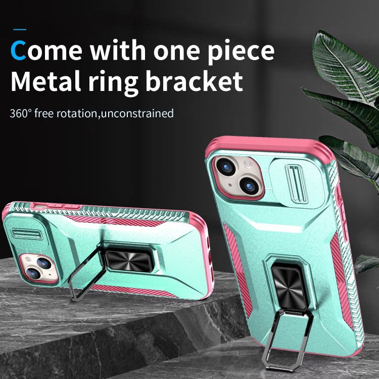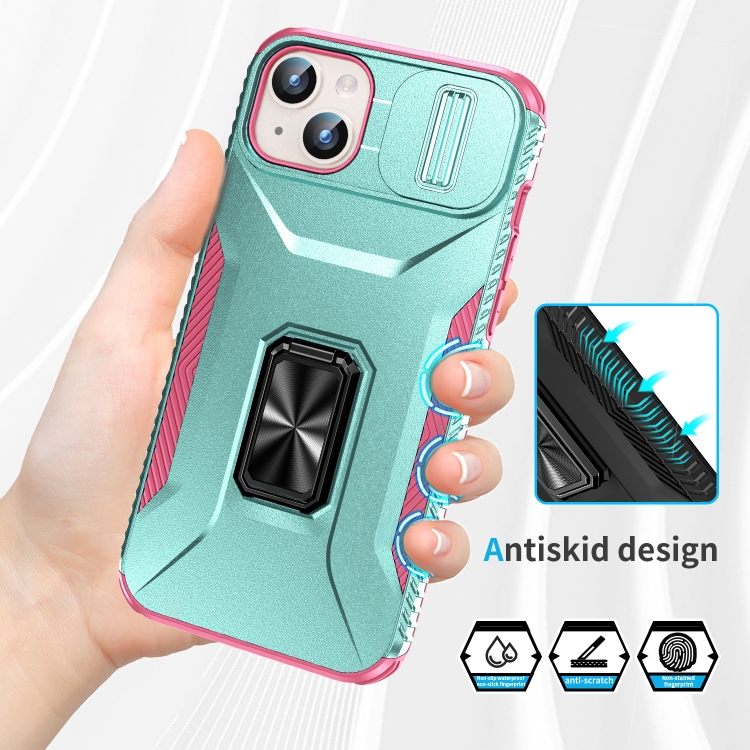 Estuche para teléfono iPhone 15 con soporte deslizante para levas (Gris Verde + Rosa)