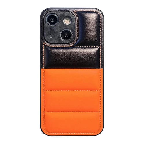 Funda para Teléfono iPhone 15 Chaqueta de Plumón con Bloques de Color (Negro Naranja)