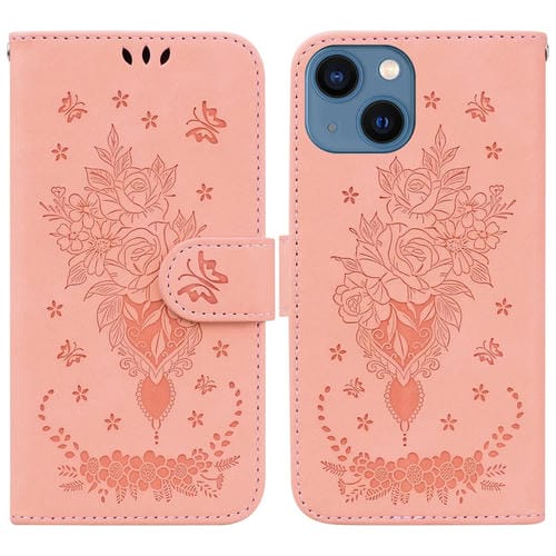 Estuche para Teléfono iPhone 15 Plus Cuero con Relieve de Mariposa (Rosa)