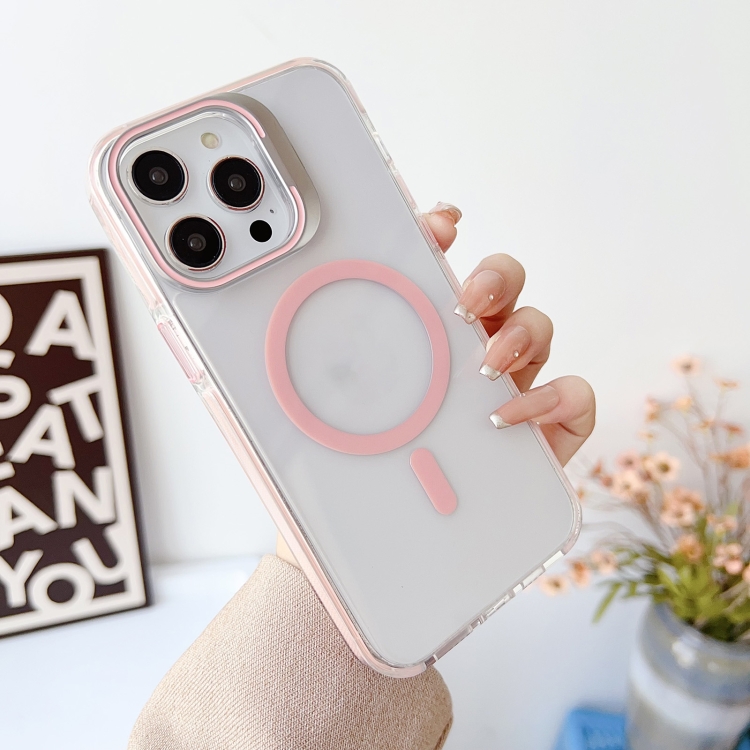 Funda para teléfono iPhone 15 Plus J2 con soporte de marco magnético Magsafe de alta transparencia (Rosa)
