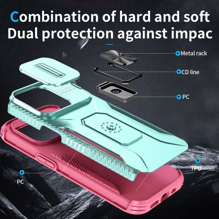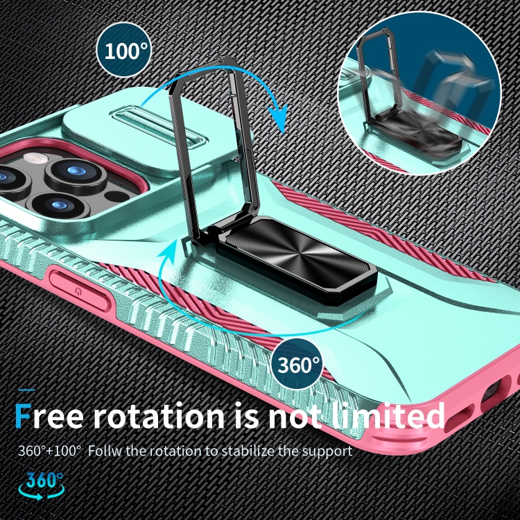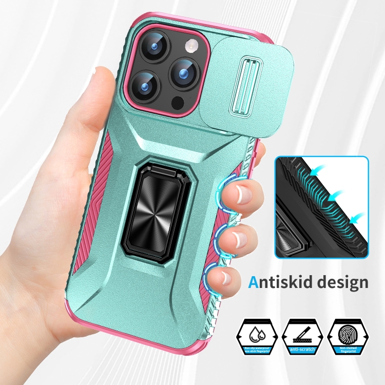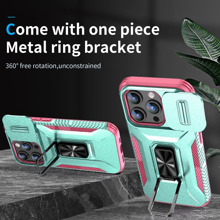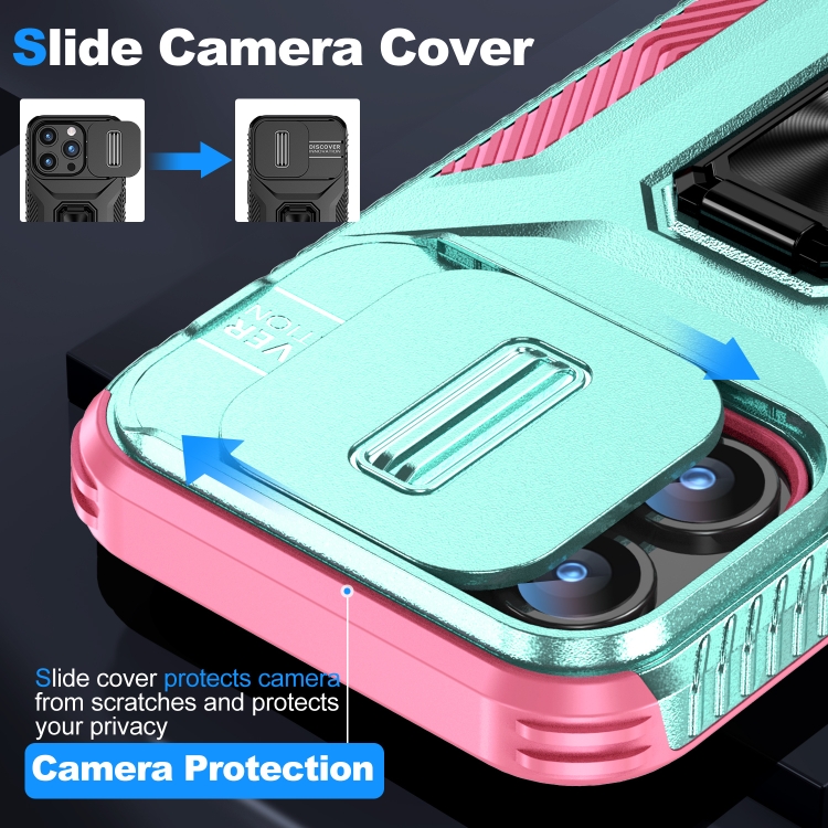 Estuche para Teléfono iPhone 15 Pro con Soporte Deslizante para Levas (Gris Verde + Rosa)