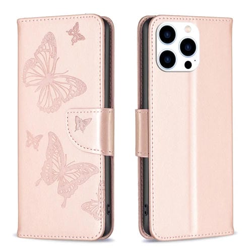 Estuche para Teléfono iPhone 15 Pro Cuero con Patrón de Dos Mariposas en Relieve (Oro Rosa)