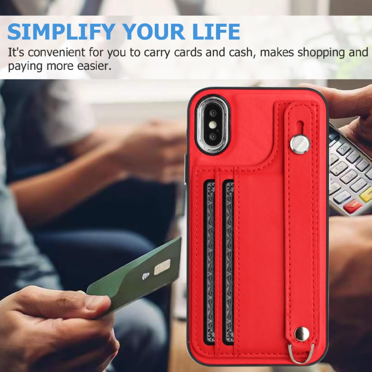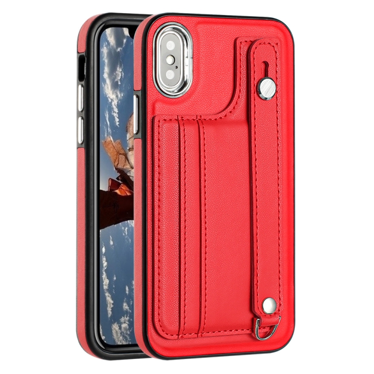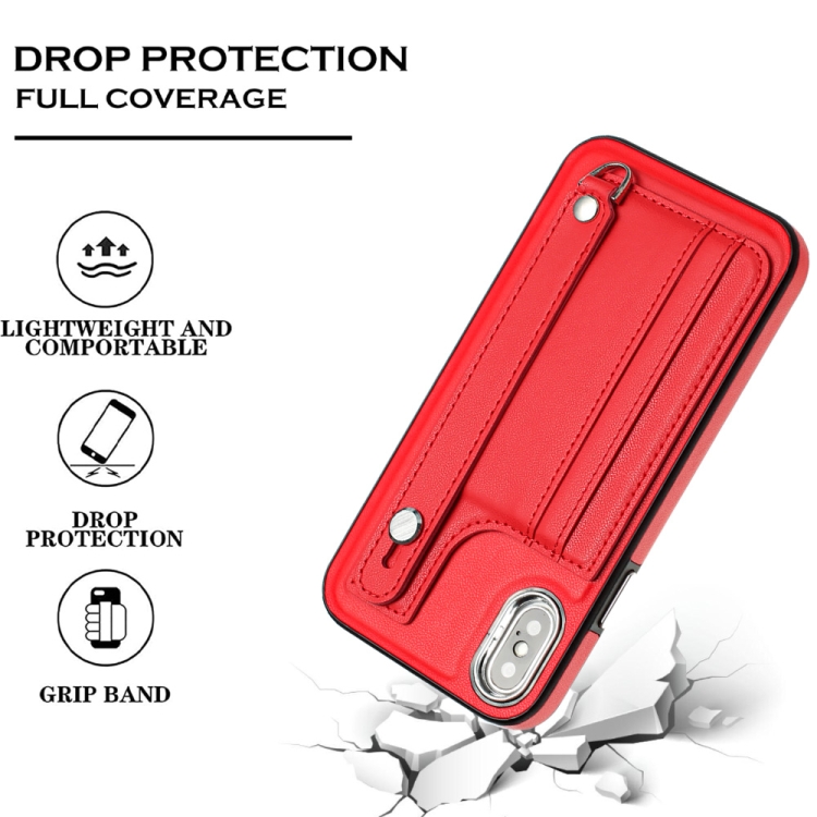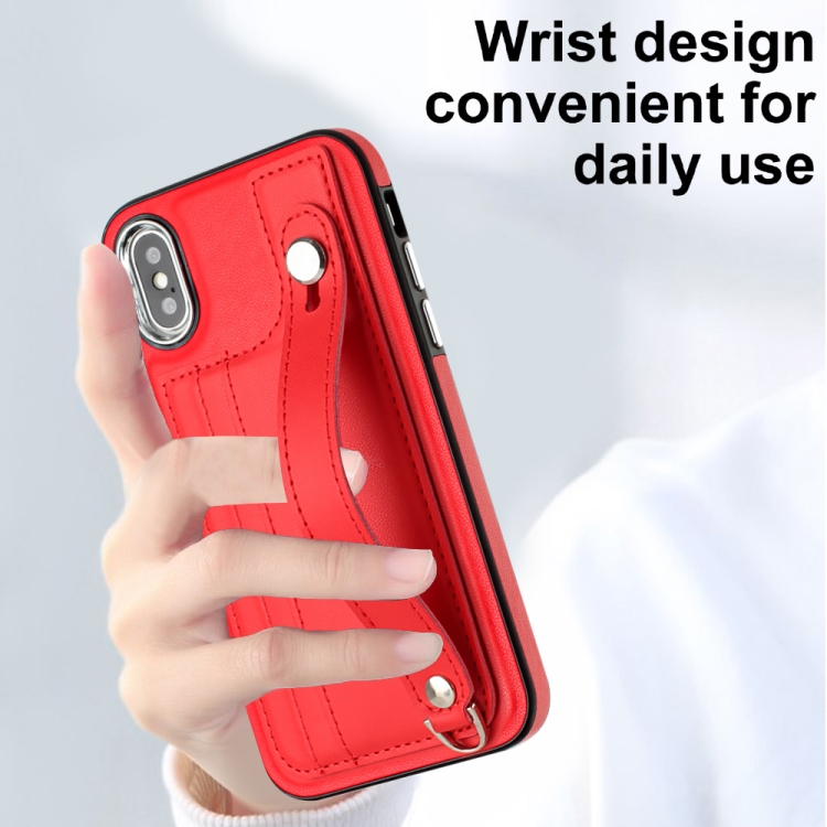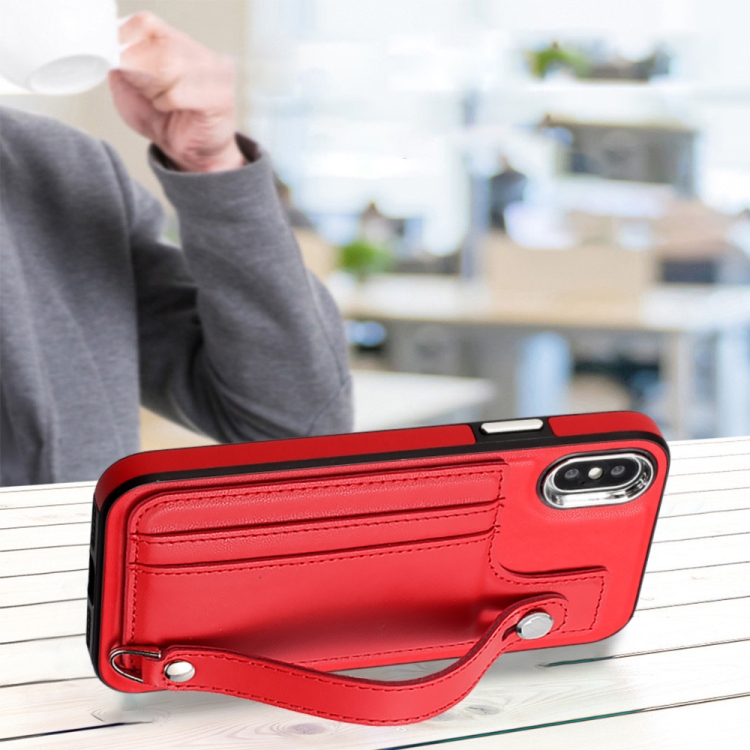 Estuche de teléfono iPhone X Xs Cuero a prueba de golpes con correa para la muñeca (Rojo)