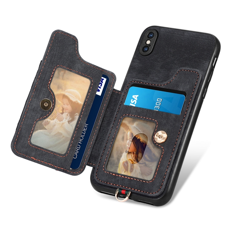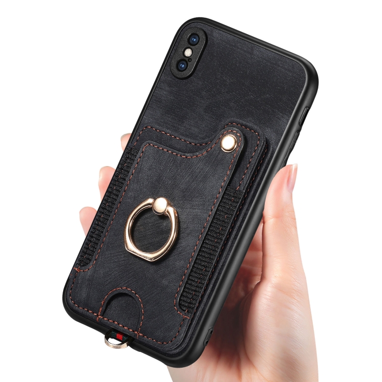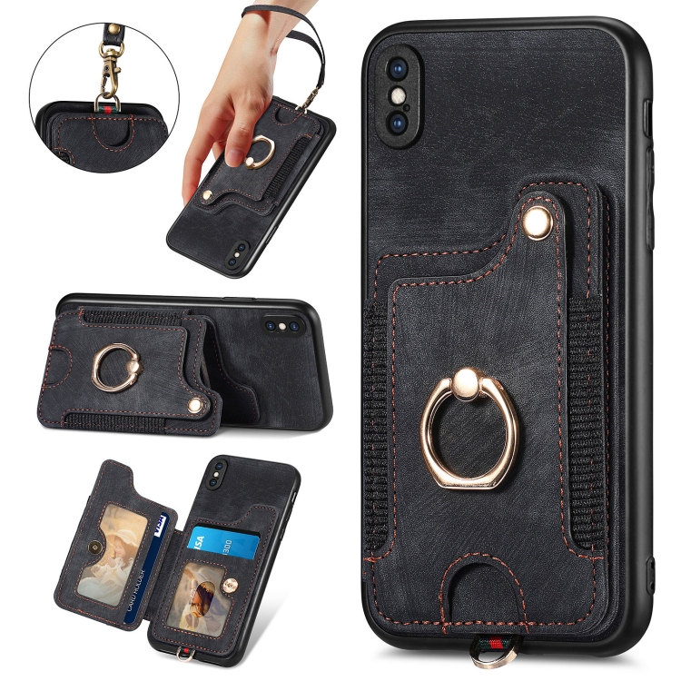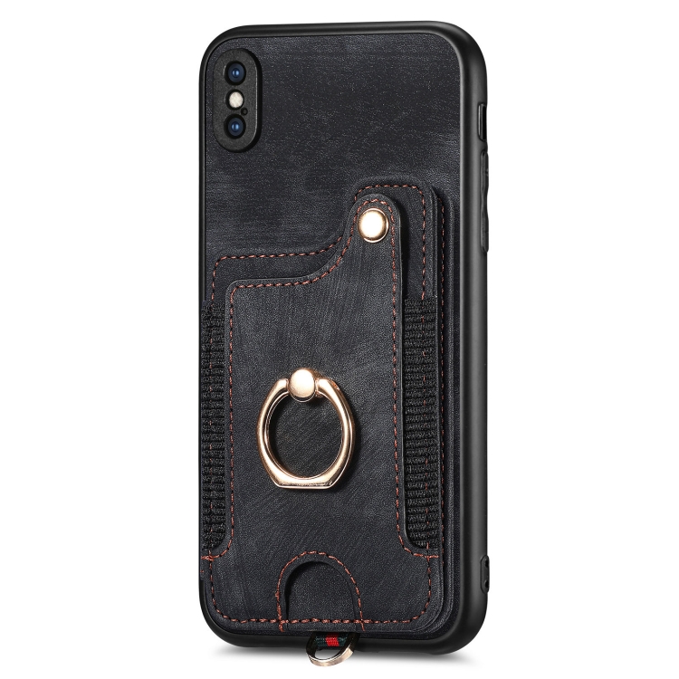 Funda para iPhone X Xs Retro Skin-Feel Ring Multi-Card Wallet (Negro)