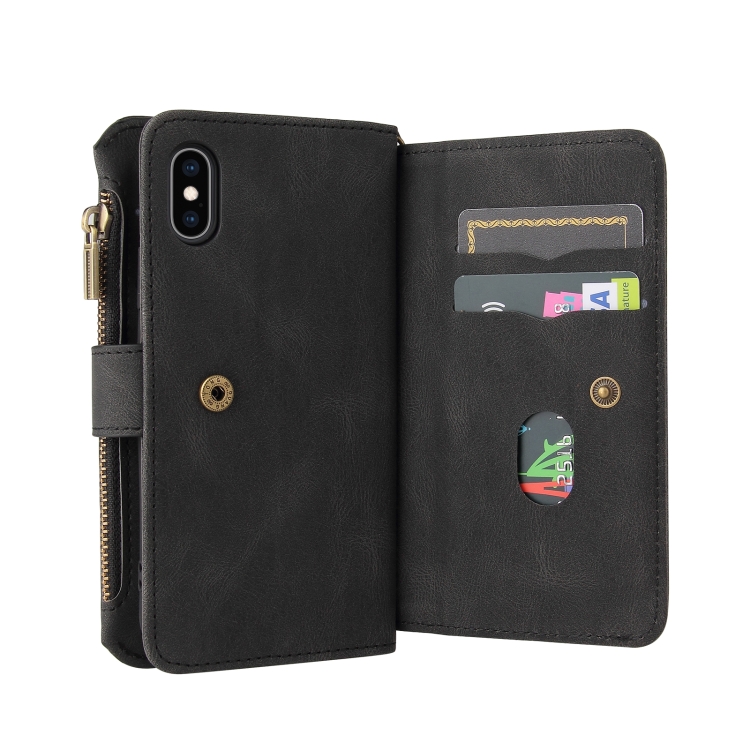 Estuche de Cuero para iPhone X Xs Skin Feel PU TPU con Tapa Horizontal Soporte Ranura para 15 Tarjetas Billetera Bolsillo Cremallera Cordón (Negro)