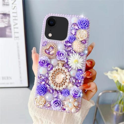 Estuche para teléfono iPhone Xr PC con incrustaciones de diamantes y rosas (Púrpura)